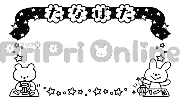 七夕飾りを作る動物たちと「たなばた」の飾り枠(白黒)