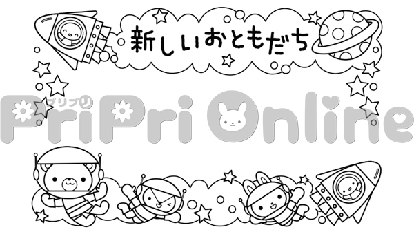 宇宙飛行をする動物たちと「新しいおともだち」の飾り枠(白黒)