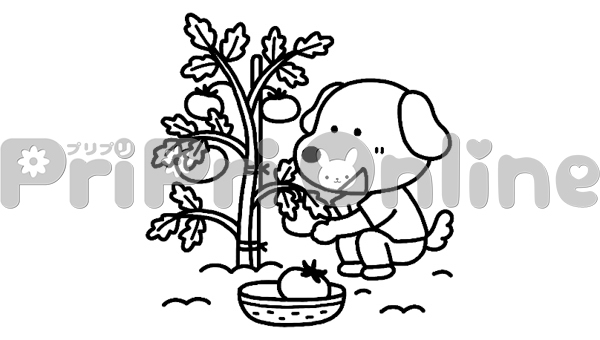 トマトを収穫する犬のイラスト(白黒)
