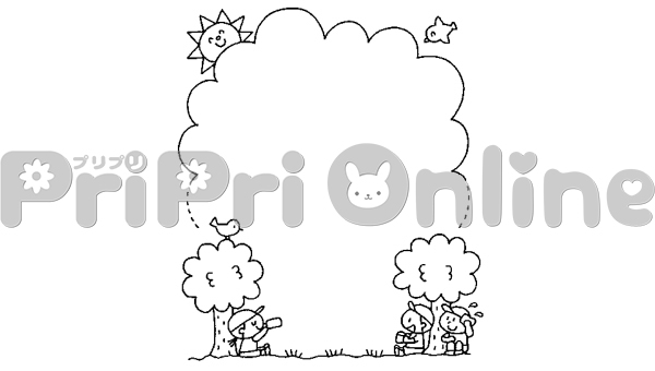 木陰で水分補給をする子どもたちの飾り枠(白黒)