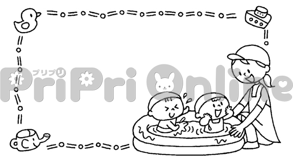 プールで遊ぶ子どもたちと保育者の飾り枠(白黒)