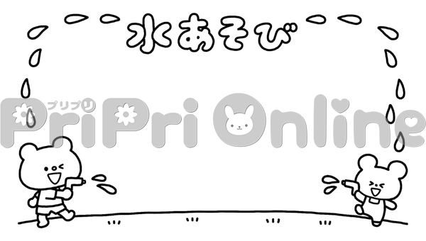 水鉄砲する動物たちと「水あそび」の飾り枠(白黒)