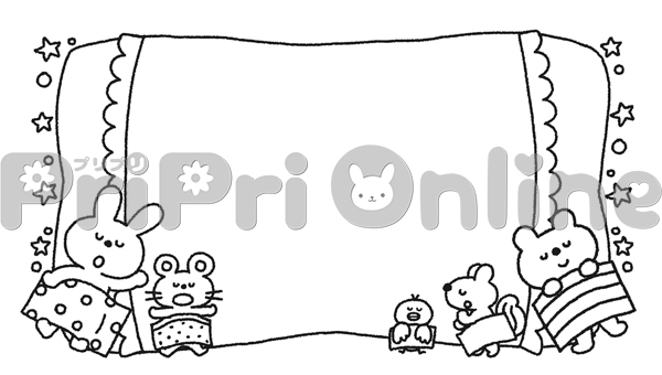 眠る動物たちと枕の飾り枠(白黒)
