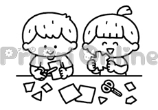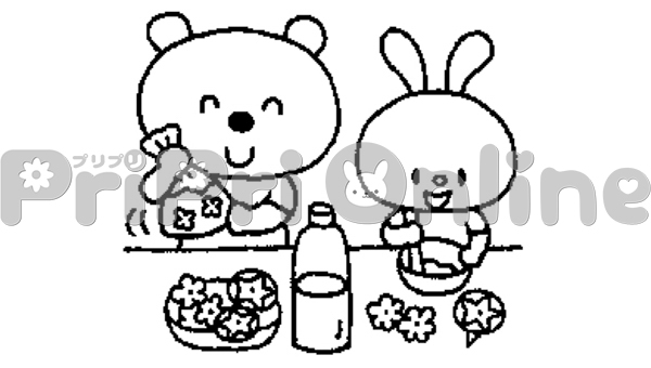 朝顔の花で色水をつくる動物たちのイラスト(白黒)