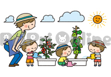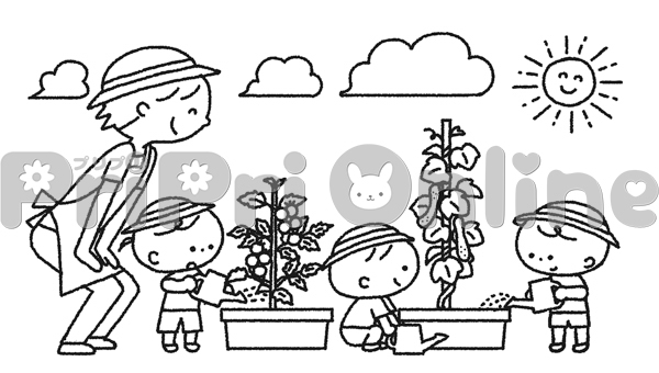 夏野菜に水やりをする子どもたちと保育者のイラスト(白黒)