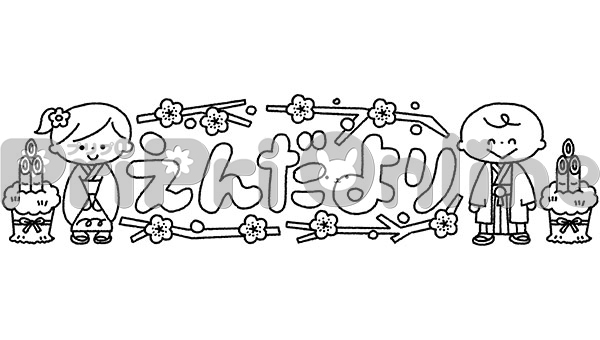 正月飾りと子どもたちと「えんだより」の飾り文字(白黒)