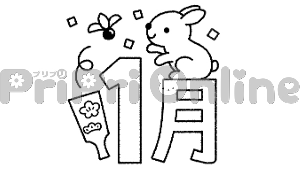 うさぎと羽根つきと「1月」の飾り文字(白黒)