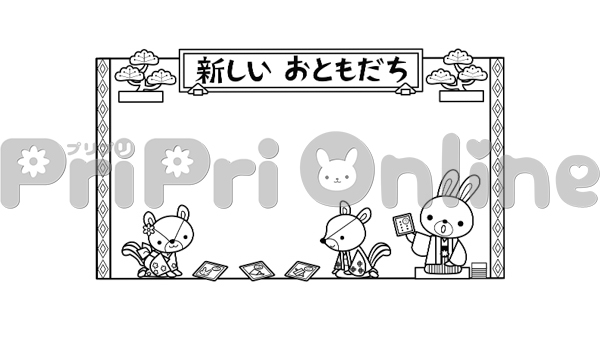 かるたと動物たちと「新しいおともだち」の飾り枠(白黒)