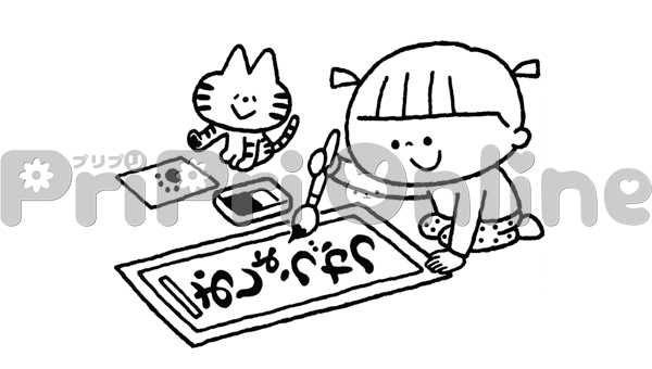 書き初めをする子どものイラスト(白黒)
