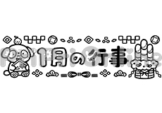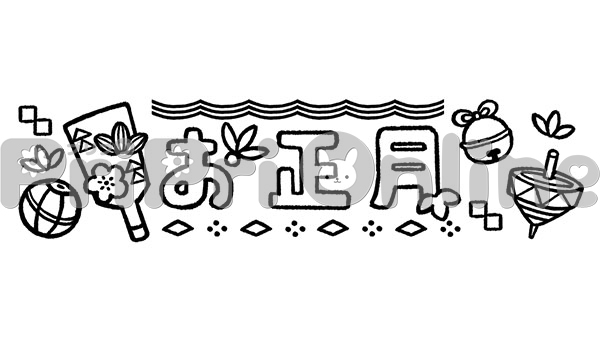 羽子板やコマや鞠と「お正月」の飾り文字(白黒)