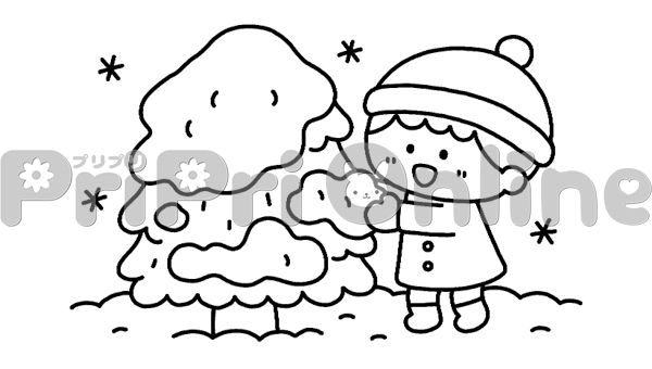 雪で遊ぶ子どものイラスト(白黒)