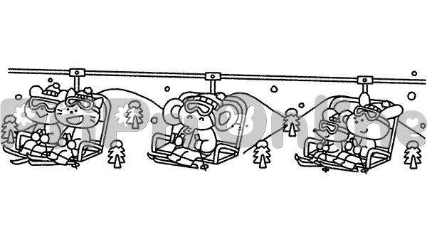 スキー場でリフトに乗る動物たちのイラスト(白黒)