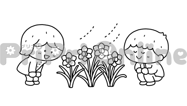 スイセンの香りを嗅ぐ子どもたちのイラスト(白黒)