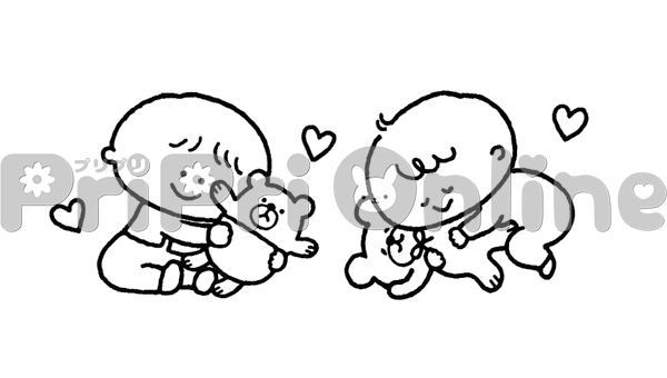 ぬいぐるみを抱きしめる乳児のイラスト(白黒)