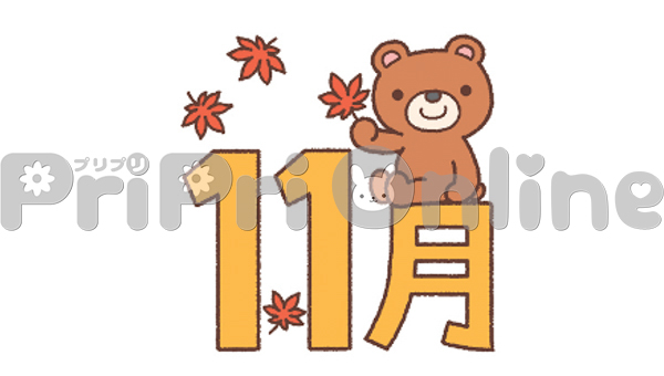クマと紅葉と「11月」の飾り文字