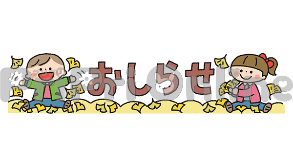 いちょうで遊ぶ子どもたちと「おしらせ」の飾り文字