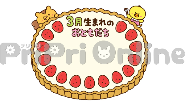 イチゴケーキと動物たちと「3月生まれのおともだち」の飾り枠