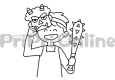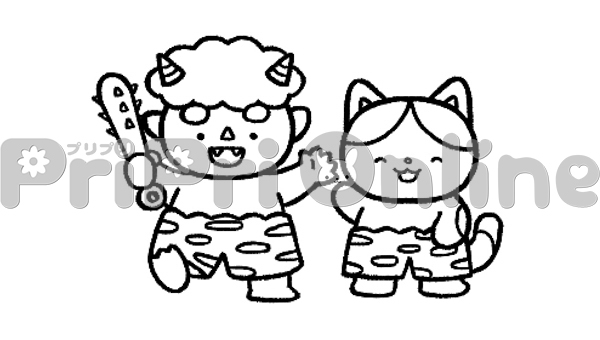 鬼と鬼のパンツを履いた猫のイラスト(白黒)