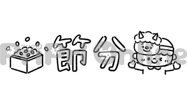 豆と鬼のお面をした子どもと「節分」の飾り文字(白黒)