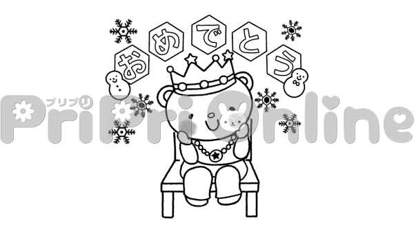 誕生日のクマと「おめでとう」の飾り文字(白黒)