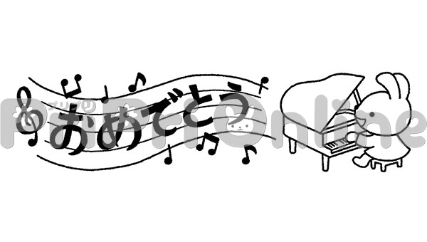ピアノを弾くうさぎと「おめでとう」の飾り文字(白黒)