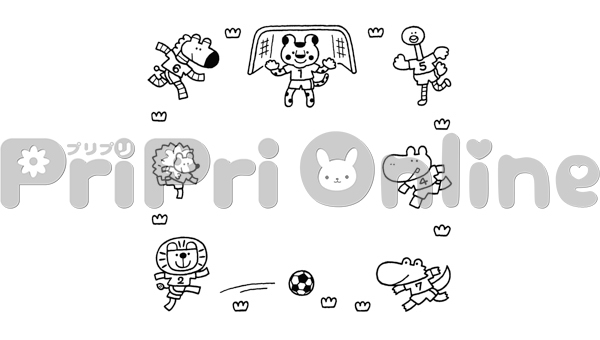 サッカーの試合をする動物たちの飾り枠(白黒)