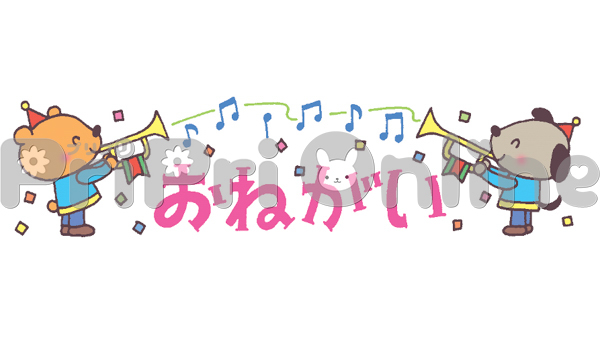 ラッパを吹く動物たちと「おねがい」の飾り文字