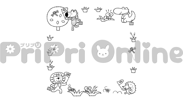 秋の虫捕りをする動物たちの飾り枠(白黒)