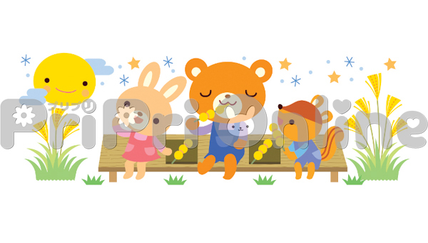 お月見しながら団子を食べる動物たちのイラスト