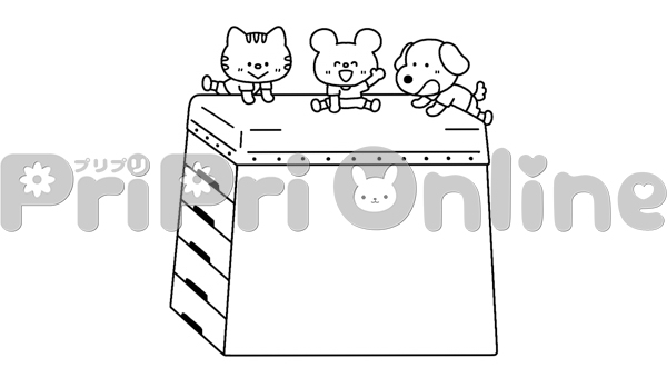 跳び箱と動物たちの飾り枠(白黒)
