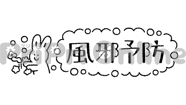 手洗いするうさぎと「風邪予防」の飾り文字(白黒)