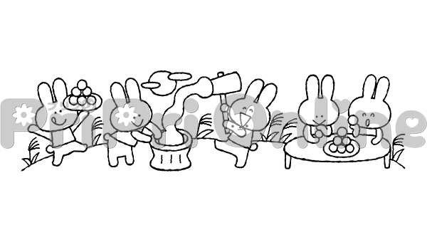 餅つきをして団子を食べるうさぎたちのイラスト(白黒)