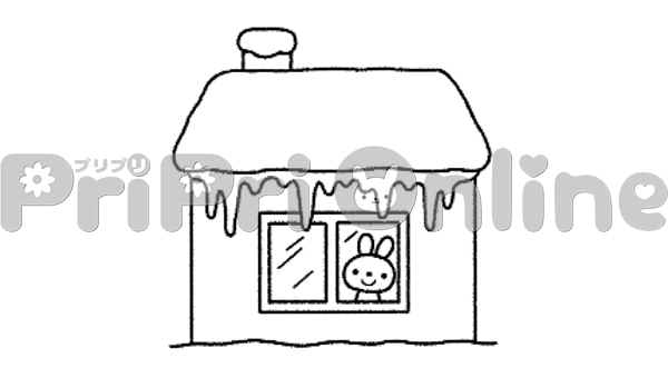 雪の日に窓から外を眺めるうさぎのイラスト(白黒)