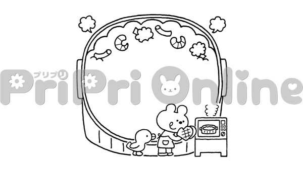 グラタンを作るクマとヒヨコの飾り枠(白黒)