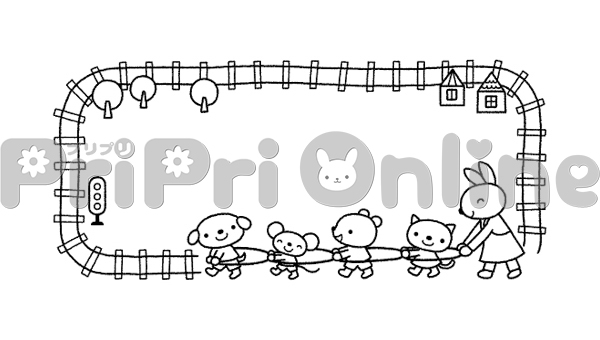 列車ごっこをする動物の子どもと保育者の飾り枠(白黒)