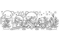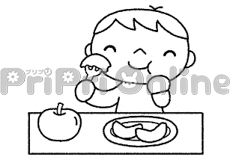 七輪で焼かれる秋刀魚を眺める男の子のイラスト(白黒)