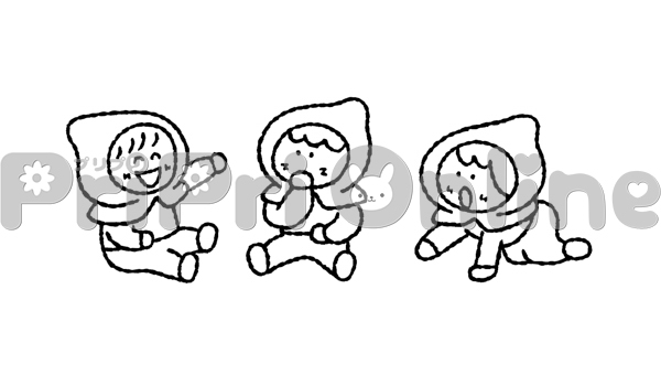 防災頭巾をかぶった乳児たちのイラスト(白黒)