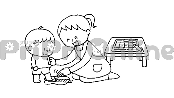 足のサイズを測る乳児と保育者のイラスト(白黒)