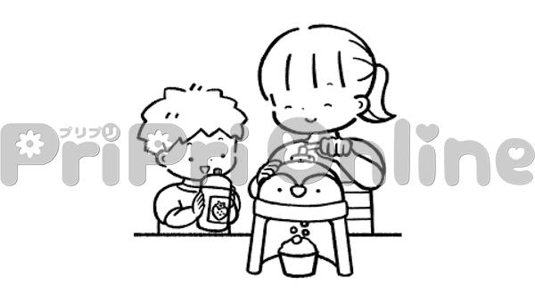 かき氷を作る親子のイラスト(白黒)