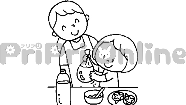 朝顔で色水を作る子どもと保育者のイラスト(白黒)
