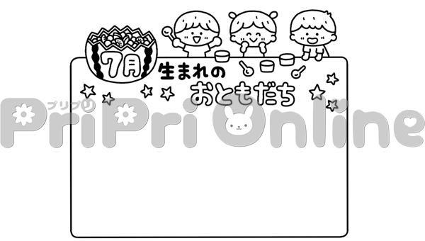 フルーツポンチと子どもと「7月生まれのおともだち」の飾り枠(白黒)