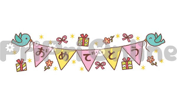 プレゼントと小鳥、「おめでとう」の飾り文字