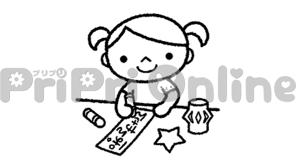 短冊に願い事を書く女の子のイラスト(白黒)