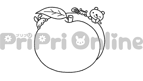 大きな桃と動物たちの飾り枠(白黒)
