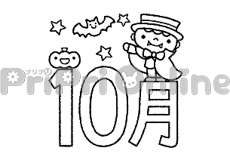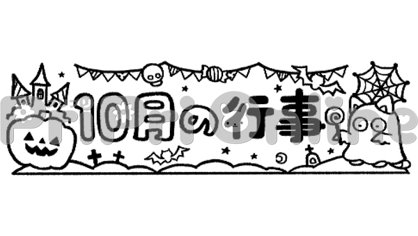 ハロウィンの様子と「10月の行事」の飾り文字(白黒)