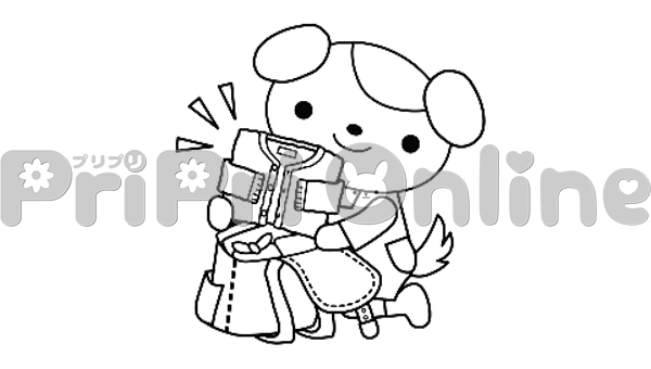 上着をリュックに詰める犬のイラスト(白黒)
