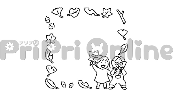 落ち葉で遊ぶ子どもたちの飾り枠(白黒)