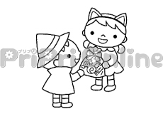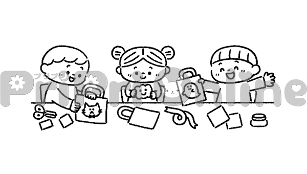 ハロウィンのかばんを作る子どもたちのイラスト(白黒)
