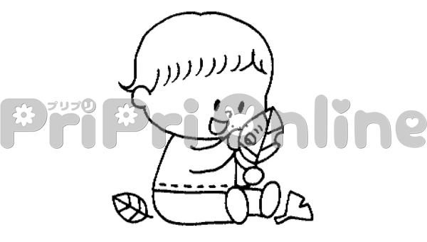 落ち葉で遊ぶ乳児のイラスト(白黒)