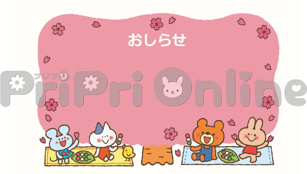 お花見する動物たちと「おしらせ」の飾り枠